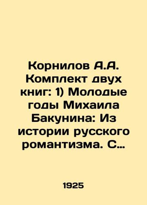 """Kornilov A.A. Set of two books: 1) The Young Years of Mikhail Bakunin: From the History of Russian Romanticism. With illustrations on separate sheets In Russian (ask us if in doubt)/Kornilov A.A. Komplekt dvukh knig: 1) Molodye gody Mikhaila Bakunina: Iz istorii russkogo romantizma. S illyustratsiyami na otdel'nykh listakh. M.: Izd. Sabashnikovykh 1915; 2) Gody stranstviy Mikhaila Bakunina. L.-M.: Gosudarstvennoe izdatel'stvo 1925 Short description: In Russian (ask us if in doubt).Set of two books 1915 1925. 1) XIV 718 4; 2) 589 3c. We have thousands of titles and often several copies of each title may be available. Please feel free to contact us for a detailed description of the copies available. SKUalbe1222e0ad0c87eda"""