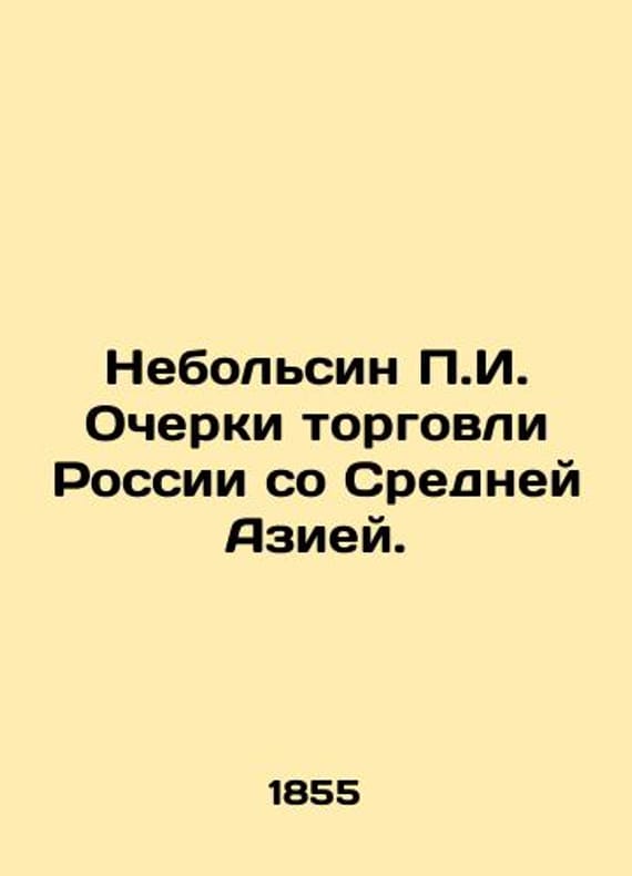 Nebolsin P.I. Essays on Russia's Trade with Central Asia. In Russian (ask us if in doubt)/Nebol'sin P.I. Ocherki torgovli Rossii so Sredney Aziey. Short description: In Russian (ask us if in doubt).St. Petersburg type. Imp. Academy of Sciences of 1855 page 442 + 8 AD - Progress of the Tashkent and Khiva caravans - Short itineraries for caravans from Russia to the main cities of the three neighboring khanates - Procedure for clearing goods from duty - Carrying goods passing through the Nizhny Novgorod Fair - Trade links between the Central Asian holdings and caravans between them - Routes through Central Asia. - Vacation items. - General comparative statement of Russian trade with the countries of Central Asia from the side of the Orenburg Line. - List of places in the northwest part of Central Asia the position of which is certain astronomically We have thousands of titles and often several copies of each title may be available. Please feel free to contact us for a detailed description of the copies available. SKUalbe27697e03765ae18