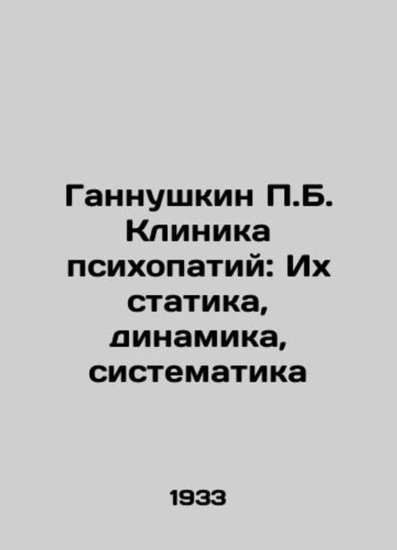 P.B. Gannushkin Psychopathy Clinic: Their Statics, Dynamics, Systematic In Russian /Gannushkin P.B. Klinika psikhopatiy: Ikh statika, dinamika, sistematika M.: Cooperative Publishing House North, The Pravda newspaper, 1933. VII, 142, 1c. We have thousands of titles and often several copies of each title may be available. Please feel free to contact us for a detailed description of the copies available. SKUalbe30823a2faa0f0b7.