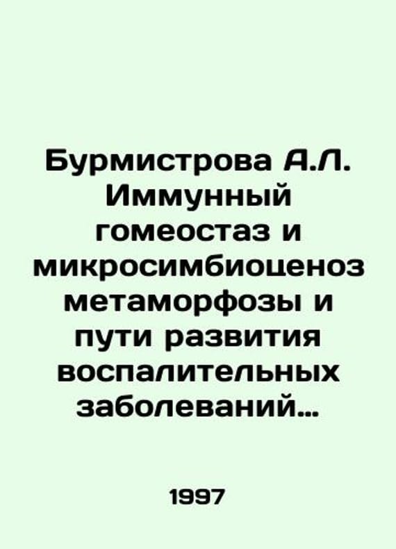 Burmistrova A.L. Immune homeostasis and microsymbiocenosis of metamorphosis and pathways of inflammatory intestinal diseases. In Russian /Burmistrova A.L. Immunnyy gomeostaz i mikrosimbiotsenoz metamorfozy i puti razvitiya vospalitelnykh zabolevaniy kishechnika. Monograph. Chelyabinsk Chelyabinsk House of Print 1997. 216 p. We have thousands of titles and often several copies of each title may be available. Please feel free to contact us for a detailed description of the copies available. SKUalbe6b34a8f862aed91.