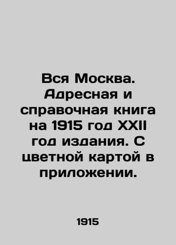 All of Moscow. Address and Reference Book for 1915 Year XXII of Edition. With Color Map in Appendix. In Russian /Vsya Moskva. Adresnaya i spravochnaya kniga na 1915 god XXII god izdaniya. S tsvetnoy kartoy v prilozhenii. M City Typography. 1915, enlarged. We have thousands of titles and often several copies of each title may be available. Please feel free to contact us for a detailed description of the copies available. SKUalbe845222c97da60c5.
