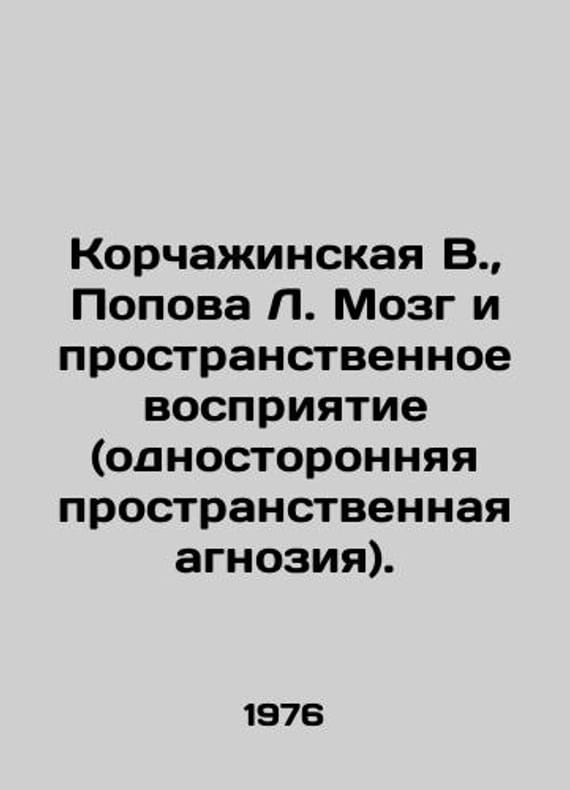 Korchazhinskaya V., Popova L. Brain and spatial perception (one-sided spatial agnosis). In Russian /Korchazhinskaya V., Popova L. Mozg i prostranstvennoe vospriyatie (odnostoronnyaya prostranstvennaya agnoziya). Series: Neurological Research. Issue 9, Moscow State University Publishing House. 1976. We have thousands of titles and often several copies of each title may be available. Please feel free to contact us for a detailed description of the copies available. SKUalbe890d6bbcda309c9.