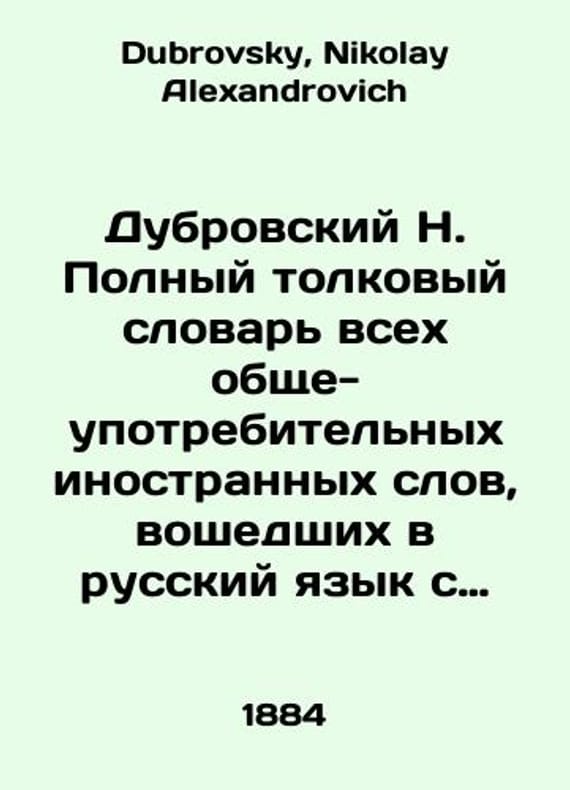 Dubrovsky N. Complete interpretive dictionary of all commonly used foreign words included in the Russian language with indication of their roots In Russian /Dubrovskiy N. Polnyy tolkovyy slovar vsekh obshche-upotrebitelnykh inostrannykh slov, voshedshikh v russkiy yazyk s ukazaniem korney Desktop reference book for everyone while reading books, magazines and newspapers. Edition 7. Moscow Edition by bookseller A. D. Stupin, 1884. 533 p. We have thousands of titles and often several copies of each title may be available. Please feel free to contact us for a detailed description of the copies available. SKUalbee0648a8f754f02c.