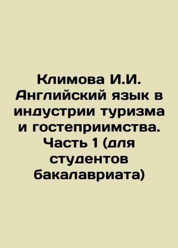 Klimova I.I. English in the Tourism and Hospitality Industry. Part 1 (for undergraduate students) In Russian /Klimova I.I. Angliyskiy yazyk v industrii turizma i gostepriimstva. Chast 1 (dlya studentov bakalavriata) Moscow Prometheus 2023. 310 p. We have thousands of titles and often several copies of each title may be available. Please feel free to contact us for a detailed description of the copies available. SKUalbee1d6c2709767124.