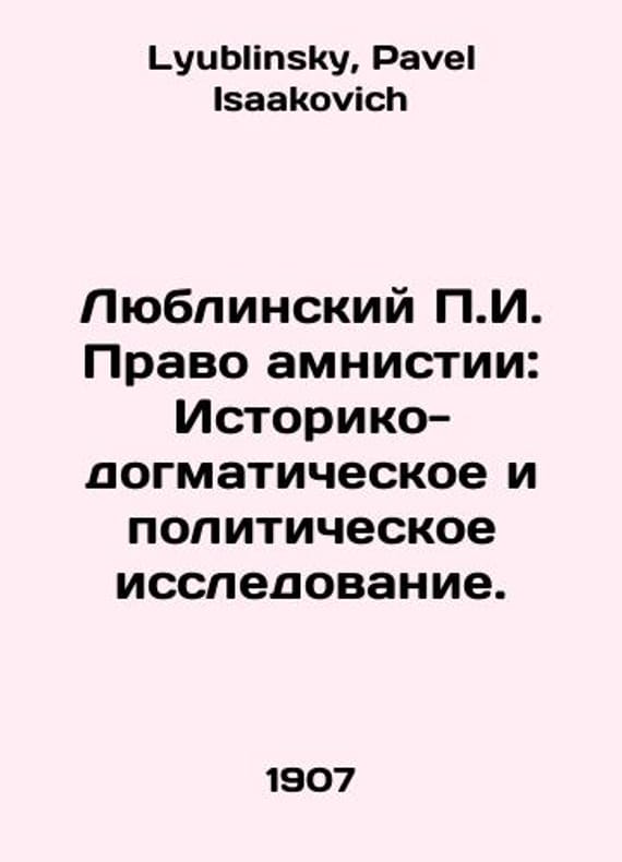 Lublin g. The Right of Amnesty: A Historical-dogmatic and Political Study. In Russian /Lyublinskiy g. Pravo amnistii: Istoriko-dogmaticheskoe i politicheskoe issledovanie. St. Petersburg: Senate Printing House 1907. 2, VIII, 3-363s. We have thousands of titles and often several copies of each title may be available. Please feel free to contact us for a detailed description of the copies available. SKUalbee92b0114519d38c.