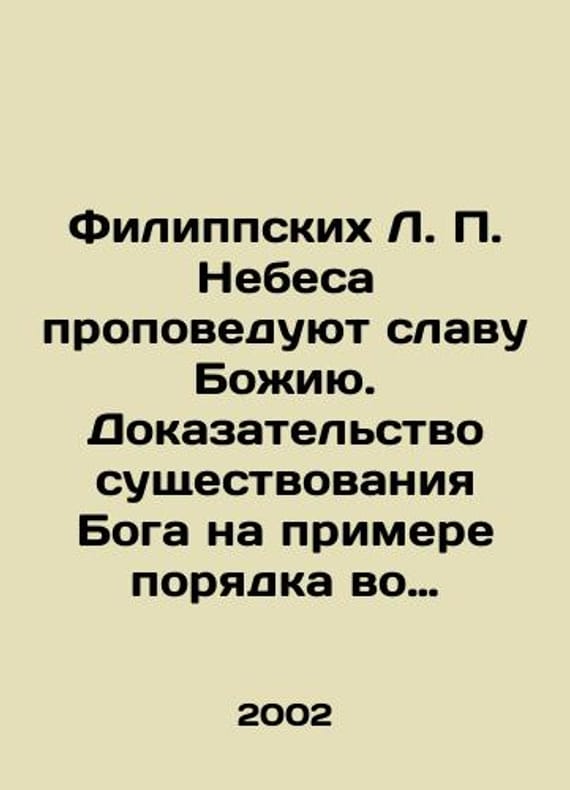 Philippine L.P. Heaven preaches the glory of God. Proof of Gods existence by the example of order in the universe. In Russian /Filippskikh L. P. Nebesa propoveduyut slavu Bozhiyu. Dokazatelstvo sushchestvovaniya Boga na primere poryadka vo Vselennoy. With the blessing of His Eminence Evologia, Archbishop of Vladimir and Suzdal. Preface by A. V. Znotnov. Vladimir. Publishing House of the Diocese of Vladimir. 2002. 112 p. We have thousands of titles and often several copies of each title may be available. Please feel free to contact us for a detailed description of the copies available. SKUalbf0913405d5307cfa.