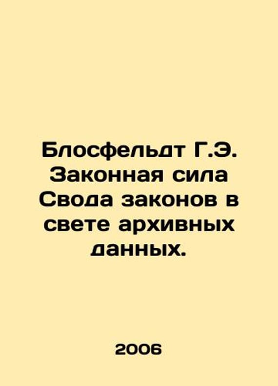Blosfeldt H.E. The validity of the Code in the light of archival data. In Russian /Blosfeldt G.E. Zakonnaya sila Svoda zakonov v svete arkhivnykh dannykh. Series: The Russian Legal Heritage of M. Zertsalo-M 2006. 292 p. We have thousands of titles and often several copies of each title may be available. Please feel free to contact us for a detailed description of the copies available. SKUalbf18d4be4850ed5a3.