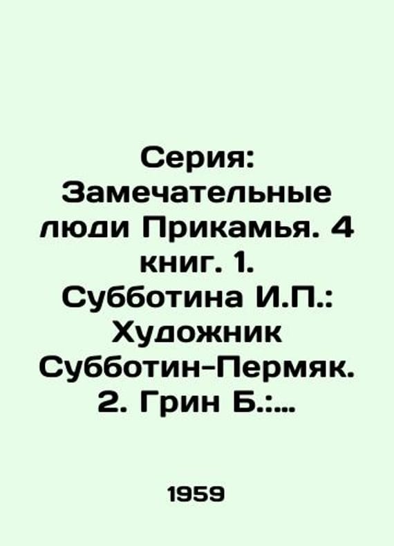 Series: Wonderful People of the Kamya Region. 4 books. 1. Subbotina I.P.: Artist Subbotin-Permyak. 2. Green B.: General Designer A.D.Shvetsov. 3. Varzakov V.: Iron Commander. 4. Terekhin A.S.: Architect Andrey Voronikhin. In Russian /Seriya: Zamechatelnye lyudi Prikamya. 4 knig. 1. Subbotina I.P.: Khudozhnik Subbotin-Permyak. 2. Grin B.: Generalnyy konstruktor A.D.Shvetsov. 3. Varzakov V.: Zheleznyy komdiv. 4. Terekhin A.S.: Arkhitektor Andrey Voronikhin. Series: The Wonderful People of the Kamya Region. Perm Book Publishing House. 1959, 1964, 1968. We have thousands of titles and often several copies of each title may be available. Please feel free to contact us for a detailed description of the copies available. SKUalbf242978ff0a59148.