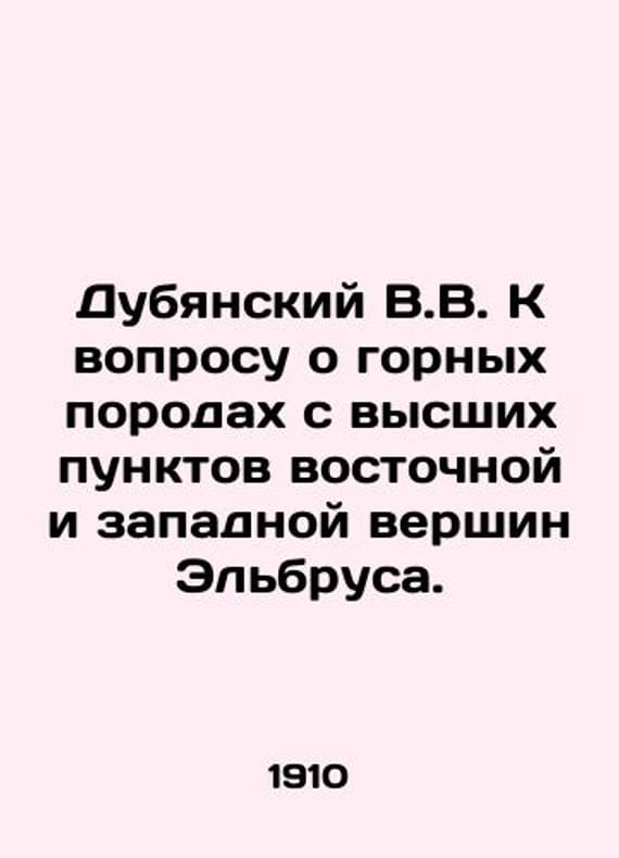 Dubyansky V.V. On the question of rocks from the highest points of the eastern and western peaks of the Elbrus. In Russian /Dubyanskiy V.V. K voprosu o gornykh porodakh s vysshikh punktov vostochnoy i zapadnoy vershin Elbrusa. Notes from the Caucasus Department of the Imperial Russian Geographic Society. Book XXV.I Volume 8. Tiflis Typography by K.P. Kozlovsky, 1910. 22 p. We have thousands of titles and often several copies of each title may be available. Please feel free to contact us for a detailed description of the copies available. SKUalbf39ab4002ebc9b30.