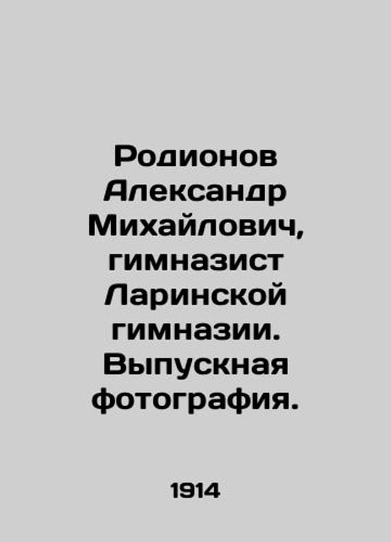 Aleksandr Rodionov, gymnasium student at Larinskaya gymnasium. Graduation photo. In Russian /Rodionov Aleksandr Mikhaylovich, gimnazist Larinskoy gimnazii. Vypusknaya fotografiya. With a gymnasium sign. St. Petersburg 1914. 5.6x8.8 sm. We have thousands of titles and often several copies of each title may be available. Please feel free to contact us for a detailed description of the copies available. SKUalbf3b12eb50baefb06.