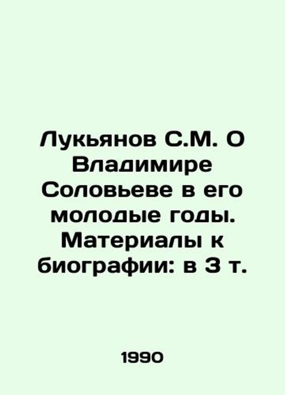 Lukyanov S.M. On Vladimir Solovyev in his Young Years. Materials for a biography: in 3 Vol. In Russian /Lukyanov S.M. O Vladimire Soloveve v ego molodye gody. Materialy k biografii: v 3 t.M.: Kniga, 1990.We have thousands of titles and often several copies of each title may be available. Please feel free to contact us for a detailed description of the copies available. SKUalbf3cefef300522763.