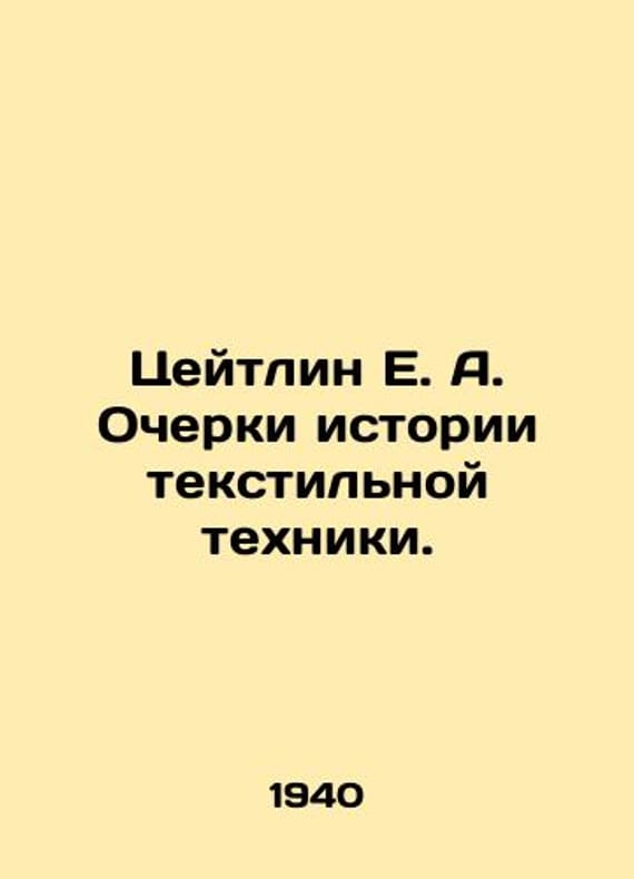 Kaitlin E. A. Essays on the History of Textile Engineering. In Russian /Tseytlin E. A. Ocherki istorii tekstilnoy tekhniki. State Publishing House of Light Industry 1940. 464s. We have thousands of titles and often several copies of each title may be available. Please feel free to contact us for a detailed description of the copies available. SKUalbf4c0d273c1bcfb34.