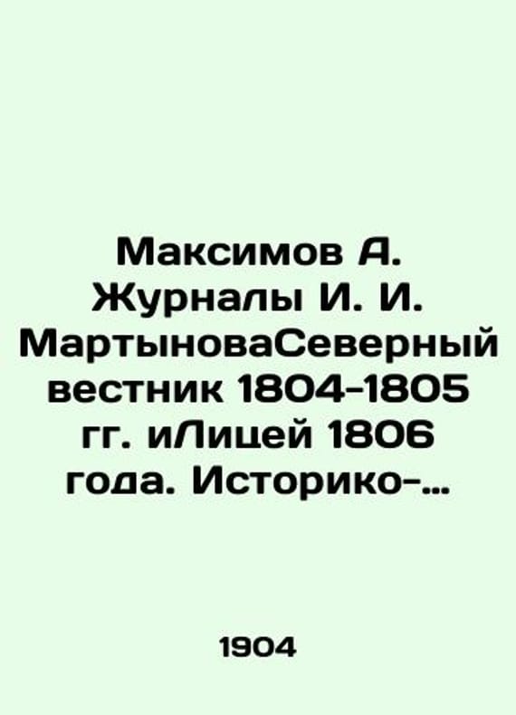 Maksimov A. Magazines I. I. Martynov Northern Bulletin of 1804-1805 and Lyceum of 1806. Historical and bibliographic research. In Russian /Maksimov A. Zhurnaly I. I. MartynovaSevernyy vestnik 1804-1805 gg. iLitsey 1806 goda. Istoriko-bibliograficheskoe issledovanie. Series: Description of Russian periodical editions of the nineteenth century. Separate print from the Literary Bulletin of 1904. St. Petersburg Typo-Lithography by A. E. Vineke. 1904. 24s. We have thousands of titles and often several copies of each title may be available. Please feel free to contact us for a detailed description of the copies available. SKUalbf6c719cb6faa8ba7.