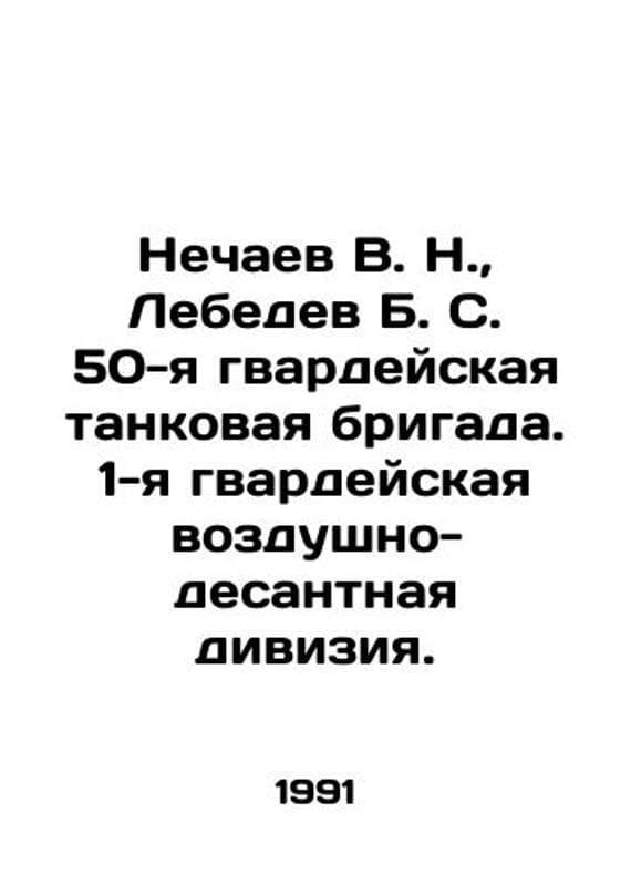 Nechaev V. N., Lebedev B. S. 50th Guards Tank Brigade, 1st Guards Airborne Division. In Russian /Nechaev V. N., Lebedev B. S. 50-ya gvardeyskaya tankovaya brigada. 1-ya gvardeyskaya vozdushno-desantnaya diviziya. Series: Front Versts. Saratov. Volga Book Publishing House 1991. We have thousands of titles and often several copies of each title may be available. Please feel free to contact us for a detailed description of the copies available. SKUalbf7cf31fac3924251.