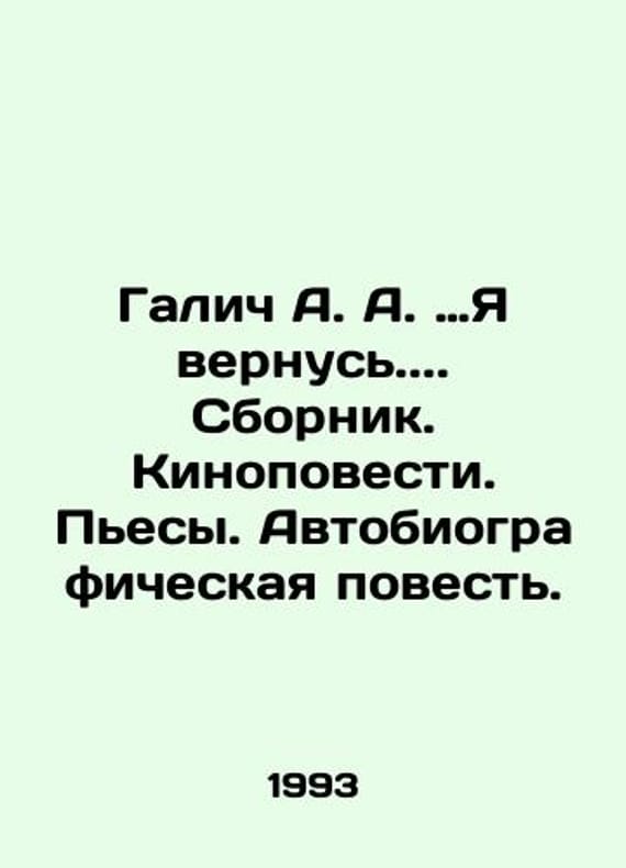 A. A. Galich Ill be back.. A collection of short stories. Plays. An autobiographical tale. In Russian /Galich A. A. Ya vernus.. Sbornik. Kinopovesti. Pesy. Avtobiograficheskaya povest. Compiled by A. A. Arkhangelskaya-Galich. Introductory article by V. R. Volin. Artist N. V. Melgunova. Moscow. Art. 1993. 400 p. We have thousands of titles and often several copies of each title may be available. Please feel free to contact us for a detailed description of the copies available. SKUalbf92951a2b7ffbbcd.