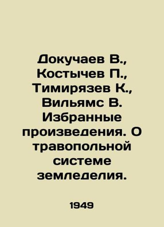 Dokuchaev V., Kostychev, Timiryazev K., Williams V. Selected works. On the herbal farming system. In Russian /Dokuchaev V., Kostychev, Timiryazev K., Vilyams V. Izbrannye proizvedeniya. O travopolnoy sisteme zemledeliya. Teachers Library. M. Uchpedgiz 1949. We have thousands of titles and often several copies of each title may be available. Please feel free to contact us for a detailed description of the copies available. SKUalbf9abd0a282a7e0b3.