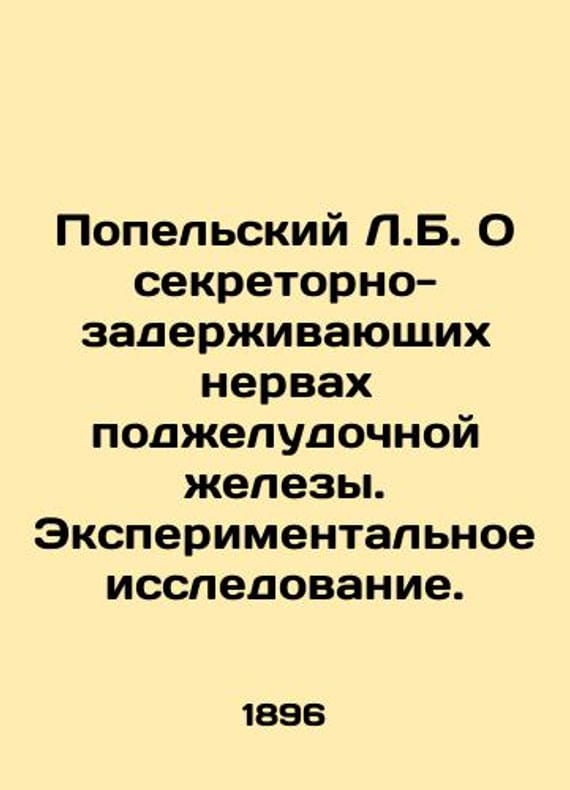 Popelsky L.B. On the secretory-retention nerves of the pancreas. An experimental study. In Russian (ask us if in doubt)/Popelskiy L.B. O sekretorno-zaderzhivayushchikh nervakh podzheludochnoy zhelezy. Eksperimentalnoe issledovanie.. Short description: In Russian (ask us if in doubt).A series of doctoral dissertations admitted to the IMPERATORS Military Medical Academy in the academic year 1896-97. # 18. St. Petersburg: P.P. Soikins Printing House Stremyannaya # 12. 1896. 125 p. We have thousands of titles and often several copies of each title may be available. Please feel free to contact us for a detailed description of the copies available. SKUalbfa0d341b2aed3008