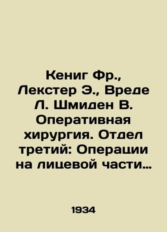 Koenig Fr., Lexter E., Vrede L. Schmidt B. Surgery. Division Three: Facial surgery. In Russian /Kenig Fr., Lekster E., Vrede L. Shmiden V. Operativnaya khirurgiya. Otdel tretiy: Operatsii na litsevoy chasti golovy. L. 1934. We have thousands of titles and often several copies of each title may be available. Please feel free to contact us for a detailed description of the copies available. The delivery of this book might be delayed beyond the usual timeframe due to extended processing and preparation before shipment, and faster shipping opSKUalbfa6b5fa64504cf75