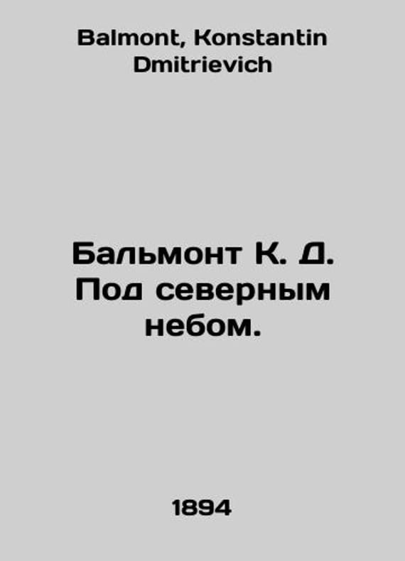 Balmont K. D. Under northern skies. In Russian /Balmont K. D. Pod severnym nebom. Elegations, Stances, Sonnets. St. Petersburg Typ. Stasyulevich. The Second Thousand. 1894 84, III p. 5x19 sm. We have thousands of titles and often several copies of each title may be available. Please feel free to contact us for a detailed description of the copies available. SKUalbfe63cfba6d4938ae.