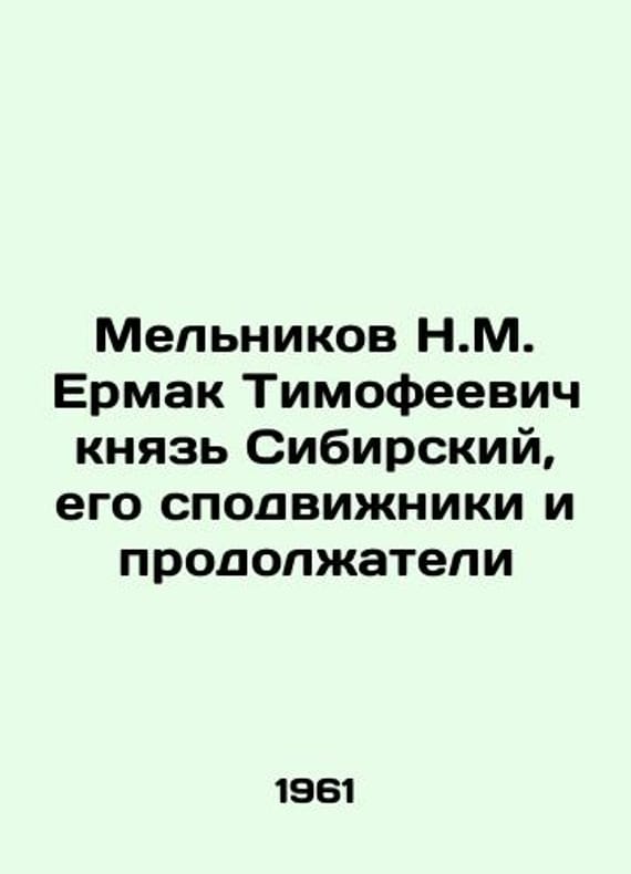 Melnikov N.M. Ermak Timofeevich Prince of Siberia his companions and successors In Russian (ask us if in doubt)/Mel'nikov N.M. Ermak Timofeevich knyaz' Sibirskiy ego spodvizhniki i prodolzhateli Short description: In Russian (ask us if in doubt).Asnieres (Seine) edition of Motherland Krai 1961 147 p. We have thousands of titles and often several copies of each title may be available. Please feel free to contact us for a detailed description of the copies available. SKUalbff2ee1d1e96290ed