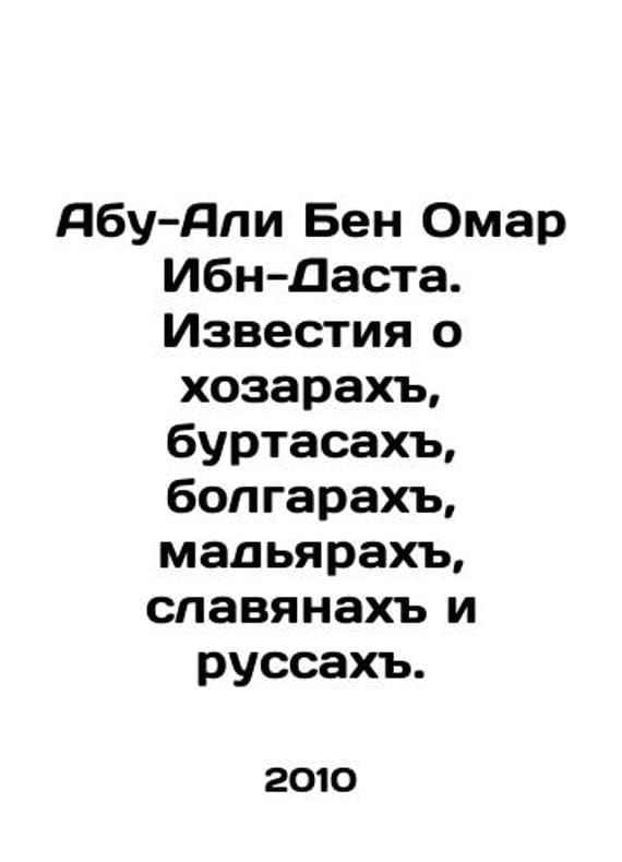Abu-Ali bin Omar Ibn-Dasta. News about the khozars, burtas, Bulgarians, magyars, Slavs, and Russians. In Russian /Abu-Ali Ben Omar Ibn-Dasta. Izvestiya o khozarakh, burtasakh, bolgarakh, madyarakh, slavyanakh i russakh. News about Khazars, Burtas, Bulgarians, Magyars, Slavs and Russ. Minsk. Ark. 2010. 199s. We have thousands of titles and often several copies of each title may be available. Please feel free to contact us for a detailed description of the copies available. SKUalbffb90d2e1370b8f9.