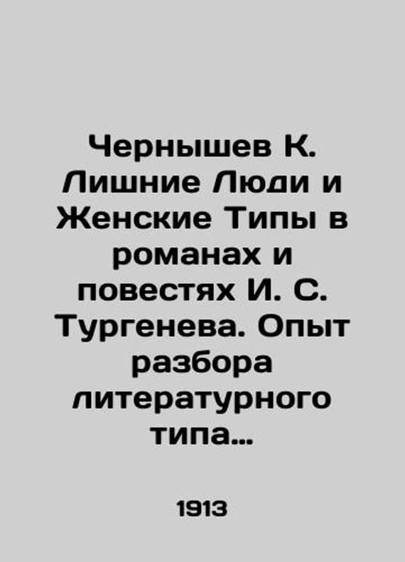 Chernyshev K. Excess People and Female Types in Novels and Novels by I. S. Turgenev. Experience of Discovering the Literary Type of Russian Excess People as Material for Characterizing the Development of Society. Edition 2, Revised. In Russian /Chernyshev K. Lishnie Lyudi i Zhenskie Tipy v romanakh i povestyakh I. S. Turgeneva. Opyt razbora literaturnogo tipa russkikh lishnikh lyudey, kak material dlya kharakteristiki razvitiya obshchestva. Izdanie 2-e, peresmotrennoe. St. Petersburg-Moscow 1913, 264 p. We have thousands of titles and often several copies of each title may be available. Please feel free to contact us for a detailed description of the copies available. SKUalbffe3c181422b08a5.