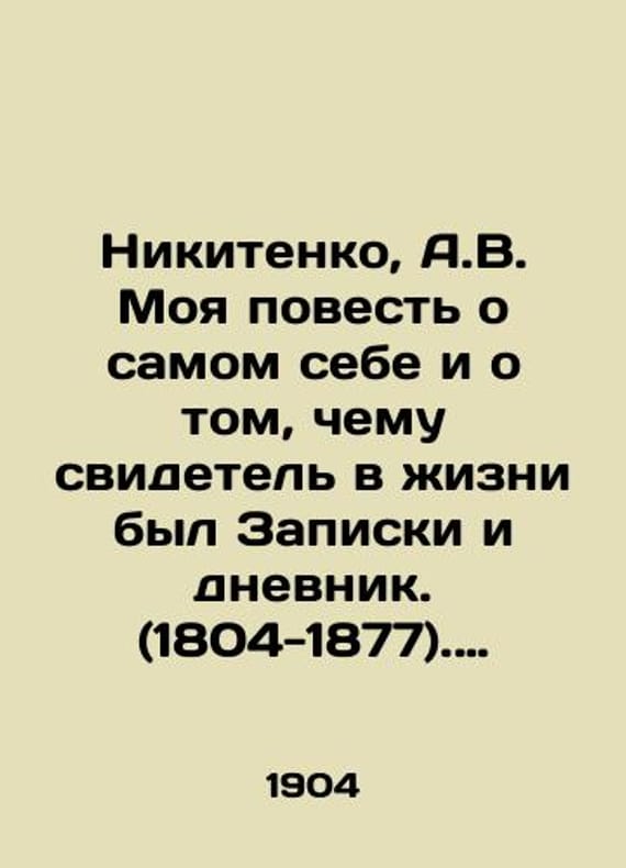 Nikitenko A.V My story about myself and what a witness in life was. Notes and diary. (1804-1877) In Russian /Nikitenko A.V Moya povest o samom sebe i o tom, chemu svidetel v zhizni byl. Zapiski i dnevnik. (1804-1877) With a portrait of the author. In 2 Vol. 1-2. St. Petersburg Typo-liter. Herold 1904-1905. Vol. 1: 1 l. We have thousands of titles and often several copies of each title may be available. Please feel free to contact us for a detailed description of the copies available. SKUalb6a864617706c4e5f.