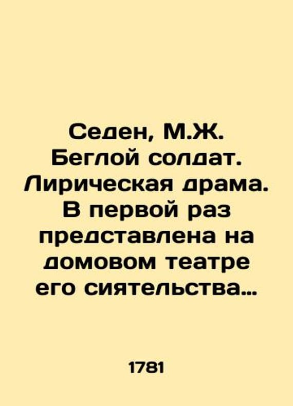 Seden, M.J. The Fugitive Soldier. Lyrical drama. For the first time presented at the house theatre of his brilliance Count Pyotr Borisovich Sheremetev by his own singers and singers of February 7, 1781, with the French Vasily Voroblevsky./Seden, M.Zh. Begloy soldat. Liricheskaya drama. V pervoy raz predstavlena na domovom teatre ego siyatelstva grafa Petra Borisovicha Sheremeteva sobstvennymi ego pevitsami i pevchimi fevralya 7 dnya 1781 goda per. s frantsuzskago Vasilem Voroblevskim. Seden, M.J. The Fugitive Soldier. Lyrical Drama. For the first time presented at the house theatre of his brilliance Count Pyotr Borisovich Sheremetev by his own singers and singers of February 7, 1781. We have thousands of titles and often several copies of each title may be available. Please feel free to contact us for a detailed description of the copies available. The delivery of this book might be delayed beyond the usual timeframe due to extended processing and preparation before shipment, and faster shipping options are not offered. Please inform us if you need the order by a certain date or have a deadline.SKUbd-1a46bacd2677039e