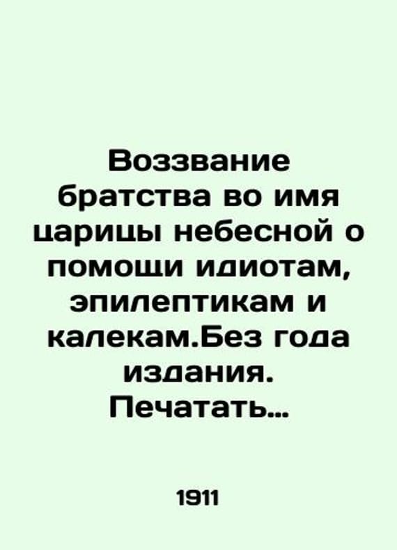 Proclamation of the brotherhood in the name of the Queen of Heaven to help idiots, epileptics, and cripples. Without a year of publication/Vozzvanie bratstva vo imya tsaritsy nebesnoy o pomoshchi idiotam, epileptikam i kalekam.Bez goda izdaniya. Pechatat razreshaetsya. Protoierey Filosof Ornatskiy. S.Pb.Tipo-Litografiya M. Frolovoy. Appeal of the brotherhood in the name of the Queen of Heaven for help to idiots, epileptics, and cripples. Without a year of publication. Printing is permitted. Archpriest Philosopher Ornatsky. St. Tipo-Lithography by M. Frolova. 16 p. St. Methodius. Abbot Peshnosh, Miracle Worker (Memory of June 14). Compiled by Archpriest Vasily Rudnev. 4th edition. With a picture from the icons of St. Methodius. Moscow. Title-Lithography by I. Efimov. 1911. 16 p. Essays on the life of the archimonk Philip, the founder of the Kinovsk Desert and the cave at the Geosyman Skete. Created by D.S. Dmitriev. We have thousands of titles and often several copies of each title may be available. Please feel free to contact us for a detailed description of the copies available. SKUbd-1cfef3c44b7e48be.