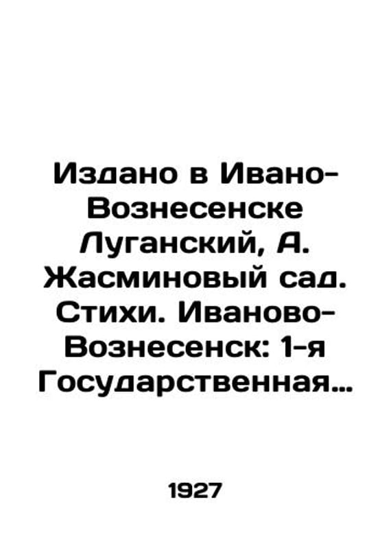 Issued in Ivano-Voznesensk Luhansk, A. Jasmine Garden. Verses. Ivanovo-Voznesensk: 1st State Printing House, 1922./Izdano v Ivano-Voznesenske Luganskiy, A. Zhasminovyy sad. Stikhi. Ivanovo-Voznesensk: 1-ya Gosudarstvennaya tipografiya, 1922. Issued in Ivano-Voznesensk Luhansk, A. Jasmine Garden. Verses. Ivanovo-Voznesensk: 1st State Printing House, 1922. We have thousands of titles and often several copies of each title may be available. Please feel free to contact us for a detailed description of the copies available. SKUbd-1e85c84cdfd076bd.