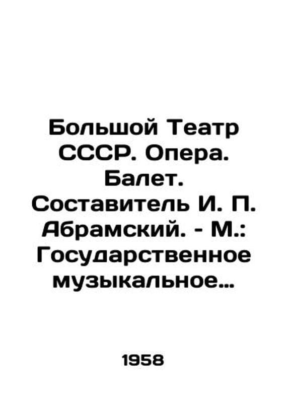 Bolshoi Theatre of the USSR. Opera. Ballet. Compiled by I. Abramsky/Bolshoy Teatr SSSR. Opera. Balet. Sostavitel I. Abramskiy. M.: Gosudarstvennoe muzykalnoe izdatelstvo, 1958. Bolshoi Theatre of the USSR. Opera. Ballet. Compiled by I. Abramsky. We have thousands of titles and often several copies of each title may be available. Please feel free to contact us for a detailed description of the copies available. SKUbd-1f84fbe05f3b9b1a.