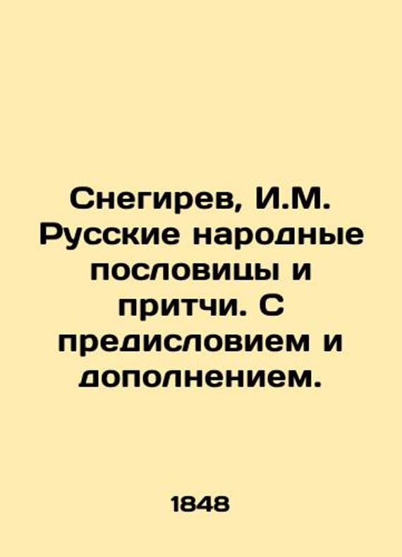 Snegirev, I.M. Russian folk proverbs and parables. With a foreword and supplement./Snegirev, I.M. Russkie narodnye poslovitsy i pritchi. S predisloviem i dopolneniem. Snegirev, I.M. Russian folk proverbs and parables. With a foreword and supplement. Moscow: In the University Type., 1848. 2, XLVI, 503, 3 p. 22.5 - 14.7 sm.We have thousands of titles and often several copies of each title may be available. Please feel free to contact us for a detailed description of the copies available. SKUbd-2217065c5958259.