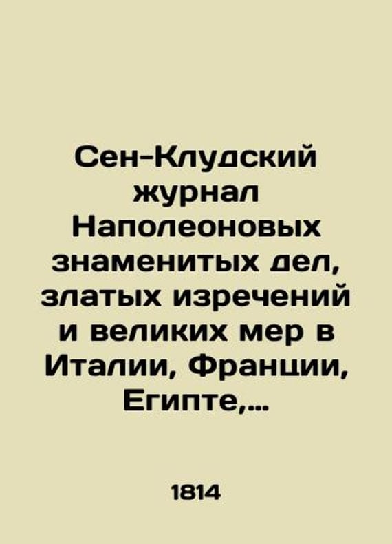 The Saint-Cloud Journal of Napoleonic Famous Deeds, Evil Words, and Great Measures in Italy, France, Egypt, Germany, Spain, and Russia, which contains a faithful drawing of Napoleons famous donations, raised to conquer the whole world and to glorify his great name: Ch. 1.-/Sen-Kludskiy zhurnal Napoleonovykh znamenitykh del, zlatykh izrecheniy i velikikh mer v Italii, Frantsii, Egipte, Germanii, Ispanii i Rossii, soderzhashchiy v sebe vernyy chertezh znamenitykh pozhertvovaniy Napoleonovykh, podyatykh dlya zavoevaniya tselogo sveta i dlya proslavleniya svoego velikogo imeni: Ch. 1.- St. Clouds Journal of Napoleonic Famous Deeds, Evil Words, and Great Measures in Italy, France, Egypt, Germany, Spain, and Russia, which contains a faithful drawing of Napoleons famous donations, raised to conquer the whole world and to glorify his great name: Ch.1.-M.: Shiryaevs Dependency, 1814.-78. We have thousands of titles and often several copies of each title may be available. Please feel free to contact us for a detailed description of the copies available. SKUbd-23107309a6a6cd2f.
