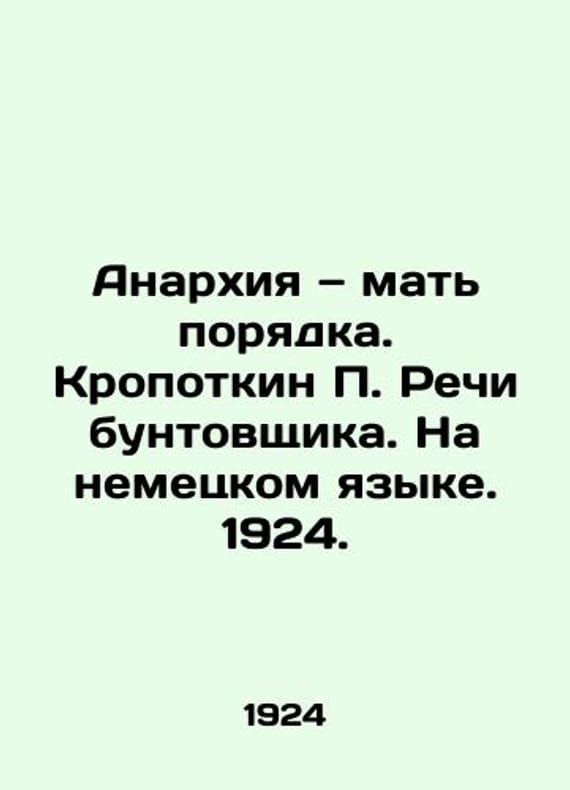 Anarchy is the mother of order. Kropotkin Speeches of a rebel. In German. 1924./Anarkhiya mat poryadka. Kropotkin Rechi buntovshchika. Na nemetskom yazyke. 1924. Anarchy is the mother of order. Kropotkin Speeches of a rebel. In German. Translation from French approved by the author, with his approved footnotes and explanations, prepared as a token of appreciation from Pierre Ramu. Second full German edition. 1924. Publishing House Knowledge and Liberation. Vienna / Klosterneuburg-Mannheim. XVI, 240 pp.We have thousands of titles and often several copies of each title may be available. Please feel free to contact us for a detailed description of the copies available. SKUbd-a5732de588d278be.