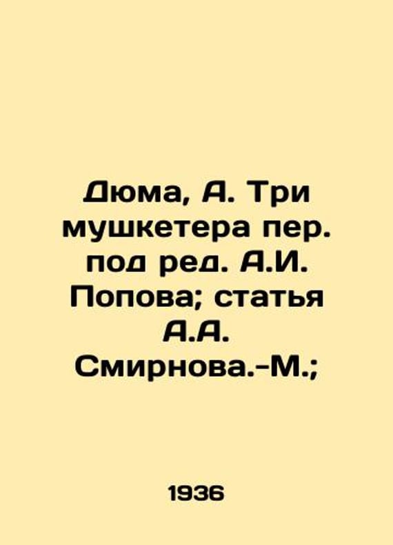 "Dumas, A. The Three Musketeers, edited by A.I. Popov; article by A.A. Smirnov-M.;/Dyuma, A. Tri mushketera per. pod red. A.I. Popova; statya A.A. Smirnova.-M.; Dumas, A. The Three Musketeers, edited by A.I. Popov; article by A.A. Smirnov-M.; L.: Academia, 1936.-1 l. We have thousands of titles and often several copies of each title may be available. Please feel free to contact us for a detailed description of the copies available. SKUbd-238958d20b4b4a99."