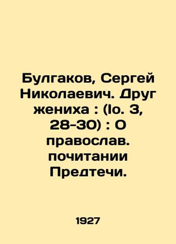 Bulgakov, Sergey Nikolaevich. Friend of the groom: (Io. 3, 28-30): On Orthodox veneration of the Precursor./Bulgakov, Sergey Nikolaevich. Drug zhenikha: (Io. 3, 28-30): O pravoslav. pochitanii Predtechi. Bulgakov, Sergei Nikolaevich. Friend of the groom: (Io. 3, 28-30): On the Orthodox veneration of the Precursor. Paris: 1927.We have thousands of titles and often several copies of each title may be available. Please feel free to contact us for a detailed description of the copies available. SKUbd-2514274f43662ad4.