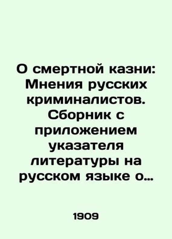 On the Death Penalty: Opinions of Russian Criminologists. A collection with an attachment to a literature index in Russian on the death penalty (Pravo. Criminal Law)/O smertnoy kazni: Mneniya russkikh kriminalistov. Sbornik s prilozheniem ukazatelya literatury na russkom yazyke o smertnoy kazni (Pravo. Ugolovnoe pravo) M., Zveno, 1909.We have thousands of titles and often several copies of each title may be available. Please feel free to contact us for a detailed description of the copies available. SKUbd-26fe18c8db26b443.
