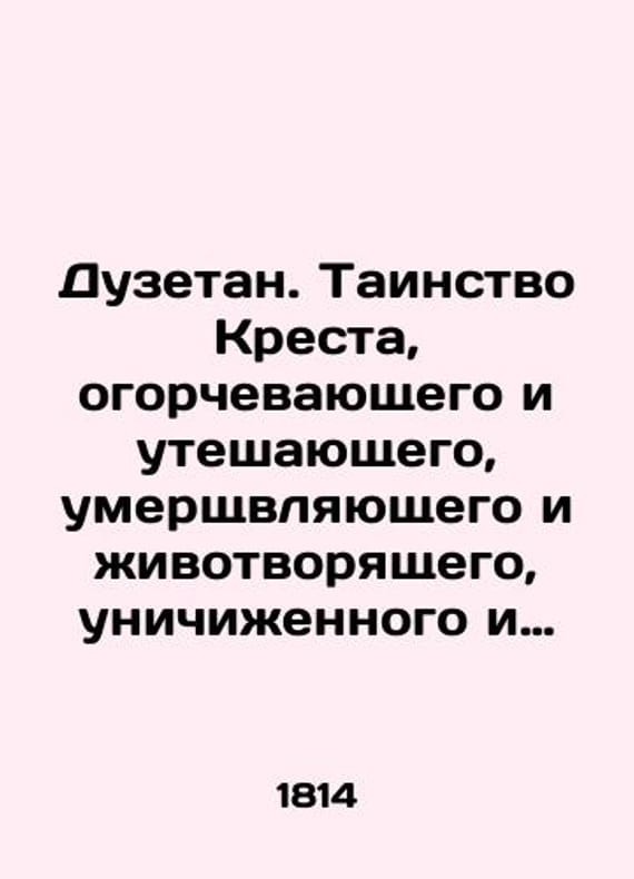 Dusetan. Mystery of the Cross, which grieves and comforts, kills and animates, humiliates and triumphs Jesus Christ and his members. Written in the middle of the Cross, inside and outside, by a disciple of the Cross of Jesus. Completed on 12 August 1732, with the addition of some poems for different occasions, also written in the fortress of Sonnenstein./Duzetan. Tainstvo Kresta, ogorchevayushchego i uteshayushchego, umershchvlyayushchego i zhivotvoryashchego, unichizhennogo i torzhestvuyushchego Iisus-Khristova i chlenov ego. Pisano posredi Kresta vnutr i vne uchenikom Kresta Iisusova. Konchano 12 Avgusta 1732 goda. S prisovokupleniem nekotorykh stikhotvoreniy na raznye sluchai, pisannykh takzhe v kreposti Zonnenshteyne. Dusetan. Mystery of the Cross, which grieves and comforts, kills and animates, humiliates and triumphs Jesus Christ and his members. Written in the middle of the Cross, inside and outside, by a disciple of the Cross of Jesus. Completed on 12 August 1732.We have thousands of titles and often several copies of each title may be available. Please feel free to contact us for a detailed description of the copies available. SKUbd-2815c6409913777b.
