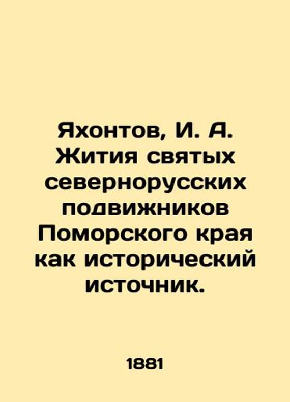 "Yakhontov, I. A. The Lives of the Holy Northern Russian Followers of Pomeranian Krai as a Historical Source./Yakhontov, I. A. Zhitiya svyatykh severnorusskikh podvizhnikov Pomorskogo kraya kak istoricheskiy istochnik. Research on the manuscripts of the Solovetsky Library - Kazan: type. Unta, 1881.-377 p.;. We have thousands of titles and often several copies of each title may be available. Please feel free to contact us for a detailed description of the copies available. SKUbd-28b9a66a4dee352d."