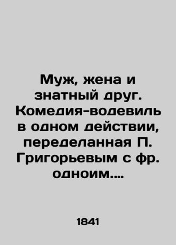 Husband, Wife, and Notable Friend. A vaudeville comedy in one act, adapted by Grigoriev from the vaudeville of the same name by E. Scrib and Melville (A.-O.-D. Duverrier) La secondde annee, ou A qui la faute? 1. Dramatic Works. St. Petersburg, 1841. /Muzh, zhena i znatnyy drug. Komediya-vodevil v odnom deystvii, peredelannaya Grigorevym s fr. odnoim. vodevilya E. Skriba i Melvilya (A.-O.-D. Dyuvere) «La seconde annee, ou A qui la faute? 1. Dramaticheskie proizvedeniya. S.Pb. 1841. Husband, Wife, and Notable Friend. A vaudeville comedy in one act, adapted by Grigoriev from the vaudeville of the same name by E. Scrib and Melville (A.-O.-D. Duverrier) La secondde annee, ou A qui la faute? 1. Dramatic Works. St. Petersburg, 1841. We have thousands of titles and often several copies of each title may be available. Please feel free to contact us for a detailed description of the copies available. SKUbd-28e537237829c3bc.