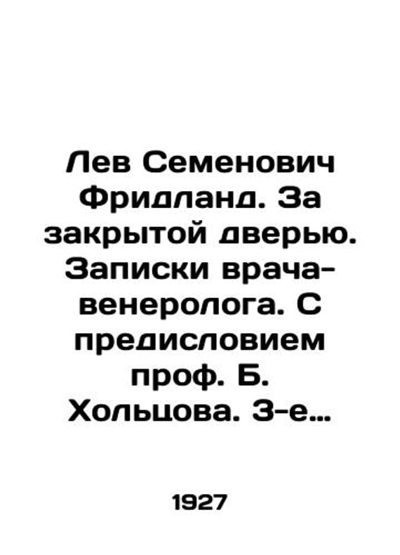 Lev Semyonovich Friedland. Behind Closed Door. Notes by a venereologist. With a foreword by Prof. B. Holtsov/Lev Semenovich Fridland. Za zakrytoy dveryu. Zapiski vracha-venerologa. S predisloviem prof. B. Kholtsova. 3-e dop. izd. Kharkov izd. Kosmos 1927 god. 204 str. Lev Semyonovich Friedland. Behind Closed Door. Notes by a venereologist. With a foreword by Prof. B. Holtsov.We have thousands of titles and often several copies of each title may be available. Please feel free to contact us for a detailed description of the copies available. SKUbd-2aac9e1245545db1.