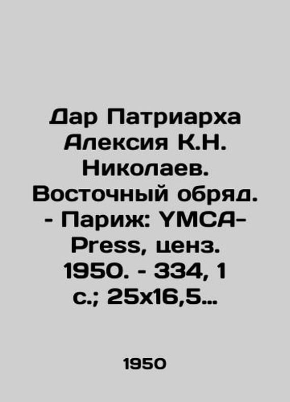"The Gift of Patriarch Alexy K.N. Nikolaev. Oriental Rite/Dar Patriarkha Aleksiya K.N. Nikolaev. Vostochnyy obryad. Parizh: YMCA-Press, tsenz. 1950. 334, 1 s.; 25x16,5 sm. The Gift of Patriarch Alexy K.N. Nikolaev. Oriental Rite. Paris: YMCA-Press, citation 1950. No. 334, 1 p.;. We have thousands of titles and often several copies of each title may be available. Please feel free to contact us for a detailed description of the copies available. SKUbd-2e85421257a76bf5."