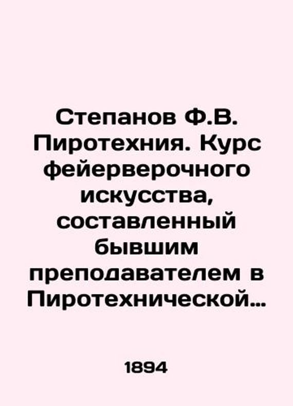 "Stepanov F.V. Pyrotechnia. A course in fireworks art, compiled by a former teacher at the Pyrotechnic Artillery School F.V. Stepanov./Stepanov F.V. Pirotekhniya. Kurs feyerverochnogo iskusstva, sostavlennyy byvshim prepodavatelem v Pirotekhnicheskoy artilleriyskoy shkole F.V. Stepanovym. Stepanov F.V. Pyrotechnia. A course in fireworks art, compiled by a former teacher at the Pyrotechnic Artillery School F.V. Stepanov. St. Petersburg: Type I.N. Skorokhodov, 1894. IV, 730 p.;. SKUbd-311139be765a8fae.We have thousands of titles and often several copies of each title may be available. Please feel free to contact us for a detailed description of the copies available. The delivery of this book might be delayed beyond the usual time due to extended processing and preparation before shipment, and faster shipping options are not offered. Please inform us if you need the order by a certain date or have a deadline.SKUbd-311139be765a8fae"