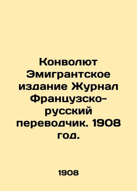Convolutee Edition of the Journal of the French-Russian Translator. 1908./Konvolyut Emigrantskoe izdanie Zhurnal Frantsuzsko-russkiy perevodchik. 1908 god. Vuibert et none editeurs. Paris, 1908 Publishers Vuibert and Noni. Paris, 1908. The Convolute included the following issues: 1. # 9. January 10 (December 28, 1907) 1908. 2. # 10. January 25 (January 12, 1908). # 11. February 10 (January 28, 1908). # 12. February 25 (February 12, 1908). # 13. March 10 (February 26, 1908). # 14. 25 March (March 12, 1908). # 15. April 10 (March 28, 1908). # 16. April 25 (April 12, 1908). We have thousands of titles and often several copies of each title may be available. Please feel free to contact us for a detailed description of the copies available. SKUbd-325b0c651edbce93.