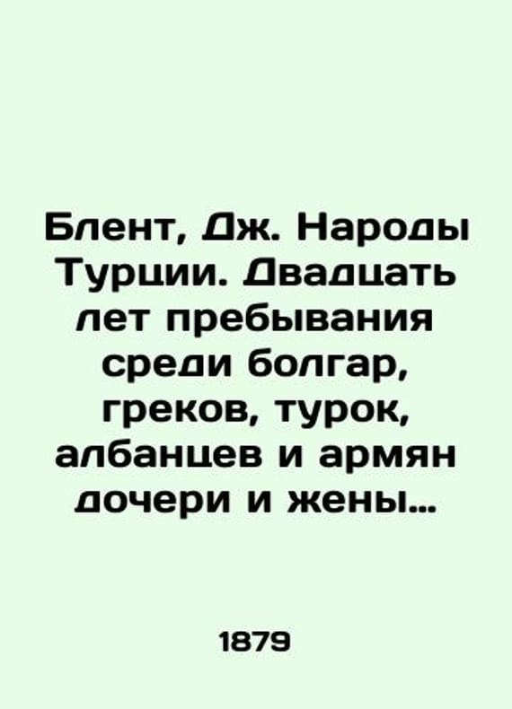 "Blent, J. Peoples of Turkey. Twenty years among Bulgarians, Greeks, Turks, Albanians, and Armenians, the daughter and wife of the consul./Blent, Dzh. Narody Turtsii. Dvadtsat let prebyvaniya sredi bolgar, grekov, turok, albantsev i armyan docheri i zheny konsula. Blent, J. Peoples of Turkey. Twenty years of being among the Bulgarians, Greeks, Turks, Albanians, and Armenians of the daughter and wife of the consul. St. Petersburg: L.F. Panteleeva Publishing House, 1879, vol. 1. On tradition, rites, education, religion among the peoples living in Turkey. I found the ceremony of introducing a newlywed woman to her new home very amusing in Macedonia: as soon as she crossed the threshold, she was put around the neck of an arcan and her husband dragged her behind her, giving her a clear lesson of the animal obedience expected of her; as she crossed the first stone of the hearth, she was forced to hit her head against a wall, as a warning against the punishment she might expect in the event of bad behavior. We have thousands of titles and often several copies of each title may be available. Please feel free to contact us for a detailed description of the copies available. SKUbd-34292c31187b2d9a."