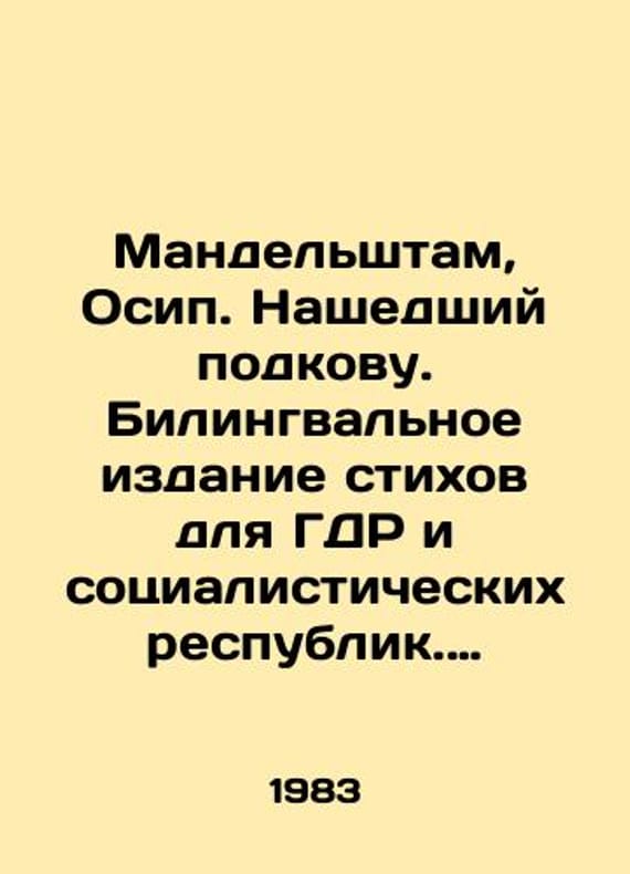 "Mandelstam, Osip. Finding a Horseshoe. Bilingual Edition of Poems for the GDR and Socialist Republics. Translated by Paul Celan et al. Editor Fritz Mirau. Leipzig: Philipp Reclam, 1983. 264 p.;/Mandelshtam, Osip. Nashedshiy podkovu. Bilingvalnoe izdanie stikhov dlya GDR i sotsialisticheskikh respublik. Perevody Paulya Tselana i dr. Redaktor Frits Mirau. Leipzig: Philipp Reclam, 1983. 264 s.; Mandelstam, Osip. Finding a Horseshoe. Bilingual Edition of Poems for the GDR and Socialist Republics. Translated by Paul Celan et al. Editor Fritz Mirau. Leipzig: Philipp Reclam, 1983. 264 p.;. We have thousands of titles and often several copies of each title may be available. Please feel free to contact us for a detailed description of the copies available. The delivery of this book might be delayed beyond the usual timeframe due to extended processing and preparation before shipment, and faster shipping options are not offered. Please inform us if you need the order by a certain date or have a deadline.SKUbd-34378740a42d4856"