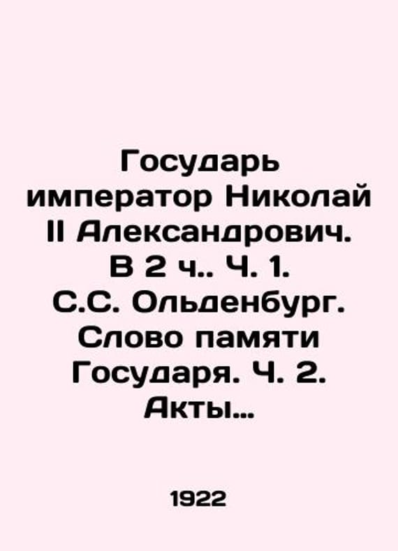 Sovereign Emperor Nicholas II Alexandrovich. In 2 h. Part 1. S. Oldenburg. Word of Memory of the Sovereign. Part 2. Acts and Results of the Kingdom./Gosudar imperator Nikolay II Aleksandrovich. V 2 ch. Ch. 1. S.S. Oldenburg. Slovo pamyati Gosudarya. Ch. 2. Akty i itogi Tsarstvovaniya. Sovereign Emperor Nicholas II Alexandrovich. In 2 h. Part 1. S. Oldenburg. Word of Memory of the Sovereign. Part 2. Acts and Results of the Kingdom. Berlin: Stag Publishers and the Foundation for the Publishing of Tsarist Portraits, 1922.We have thousands of titles and often several copies of each title may be available. Please feel free to contact us for a detailed description of the copies available. SKUbd-379085074a7e367a.