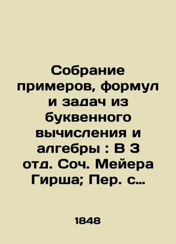 "A collection of examples, formulas and tasks from algebra and algebra: In the Third Department of Soc. Meyer Hirsch; Translated with German Eng. -Lieutenant L. Brichev./Sobranie primerov, formul i zadach iz bukvennogo vychisleniya i algebry: V 3 otd. Soch. Meyera Girsha; Per. s nem. inzh.-poruchik L. Kirpichev. A collection of examples, formulas and problems from algebra and algebra: In the Third Department of Soc. Meyer Hirsch; Translated from German by Lieutenant-General L. Brichev - 3rd edition, spr. -St. Petersburg: type I. Glazunov and Ko, 1848.-6, 158, 2, 149, 6 p.;.We have thousands of titles and often several copies of each title may be available. Please feel free to contact us for a detailed description of the copies available. SKUbd-38a6b167351142c9."