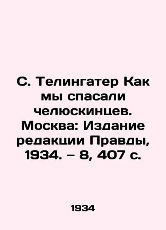 S. Telingater How We Saved Chelyuskintsev. Moscow: Pravda Editorial Board, 1934. Volume 8, 407 p./S. Telingater Kak my spasali chelyuskintsev. Moskva: Izdanie redaktsii Pravdy, 1934. 8, 407 s. Freiberg, S. Telingater, N. Sedelnikov took part in the design of the series: the schmuzzle titles and capital letters of D. Bazhanovs work. The book How We Saved the Chelyuskintsev collected the stories of the participants of the rescue expedition, including pilots A. V. Lyapidevsky (1908-1983) and S. A. Levanevsky (1902-1937), the first heroes of the Soviet Union, and attached a diagram of the routes of air expeditions.. SKUbd-38b8e0179ff0e54f.We have thousands of titles and often several copies of each title may be available. Please feel free to contact us for a detailed description of the copies available. The delivery of this book might be delayed beyond the usual time due to extended processing and preparation before shipment, and faster shipping options are not offered. Please inform us if you need the order by a certain date or have a deadline.SKUbd-38b8e0179ff0e54f
