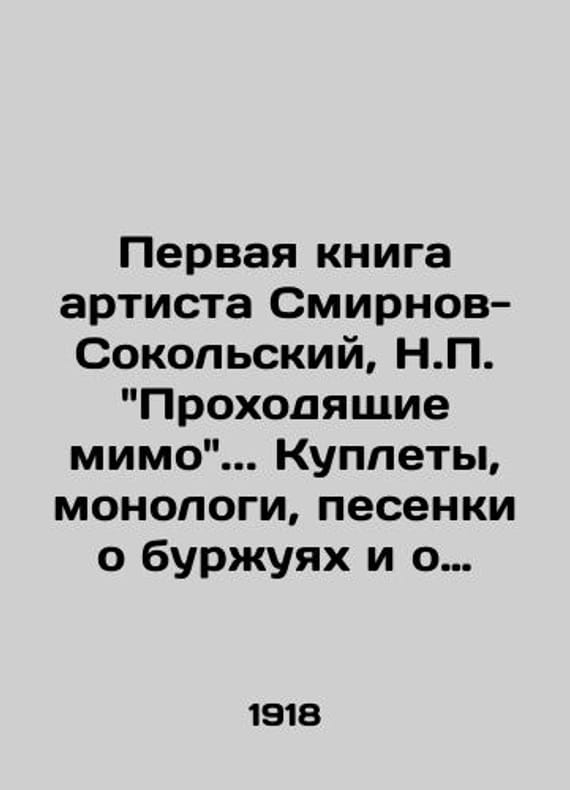 The first book by the artist Smirnov-Sokolsky, N. Passing by.. Couplets, monologues, songs about the bourgeois and other such things/Pervaya kniga artista Smirnov-Sokolskiy, N. Prokhodyashchie mimo.. Kuplety, monologi, pesenki o burzhuyakh i o prochem takom. Tetrad 1 edinstv. The first book of the artist Smirnov-Sokolsky, N. Passing by.. Couplets, monologues, songs about bourgeois and other such things. We have thousands of titles and often several copies of each title may be available. Please feel free to contact us for a detailed description of the copies available. The delivery of this book might be delayed beyond the usual timeframe due to extended processing and preparation before shipment, and faster shipping options are not offered. Please inform us if you need the order by a certain date or have a deadline.SKUbd-39a403a3e3fa3da5